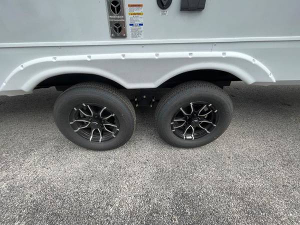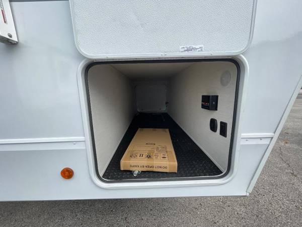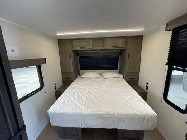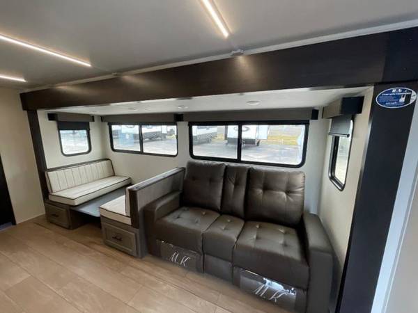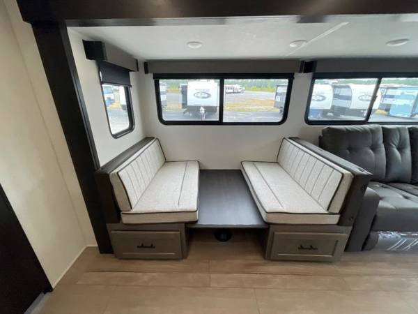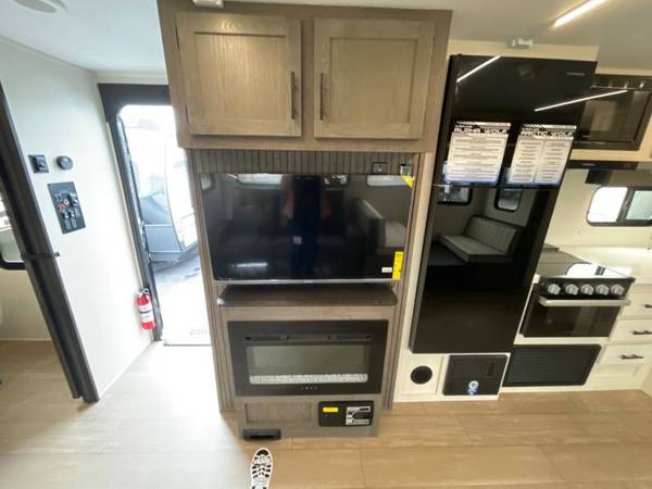 Head to your local state park in this travel trailer with a large slide out! You will love having more space to move about, and your crew can relax on the theater seating or play a game at the booth dinette. An optional TV can be added to the entertainment center, and the fireplace will make it feel a little more like home. There is a three burner cooktop and microwave oven in the kitchen, along with a 12V refrigerator and a walk-in pantry. If you enjoy cooking outdoors, then the outside kitchen will be waiting for you! The full rear bath will let you freshen up before bed, and the queen bed is sure to bring a great night's rest!